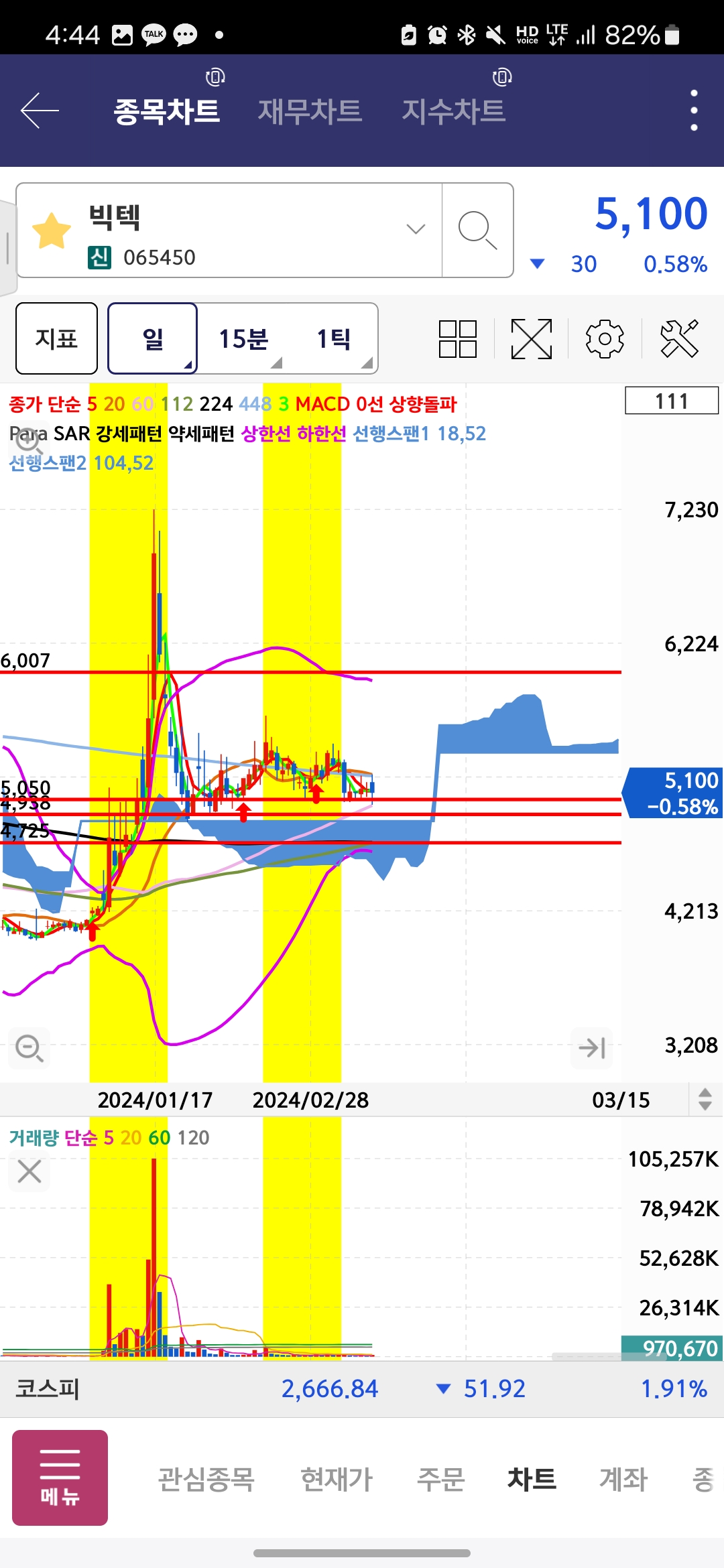 왜 손절이 났을까 생각을 해본다면, 주도 테마가 아닌 경우(빅텍) 전쟁테마가 현재 크게 이슈화가 되지 않아서 오랜시간 기다리고 있었는데 마지막 지지라인이 깨져서 손절을 했다. 옛날 같았으면 막연히 오를거라는 기대감으로 추가매수 했겠지만, 이젠 올라버려도 큰 상관없다. 아직은 오를 타이밍이 아니라고 생각하겠다.