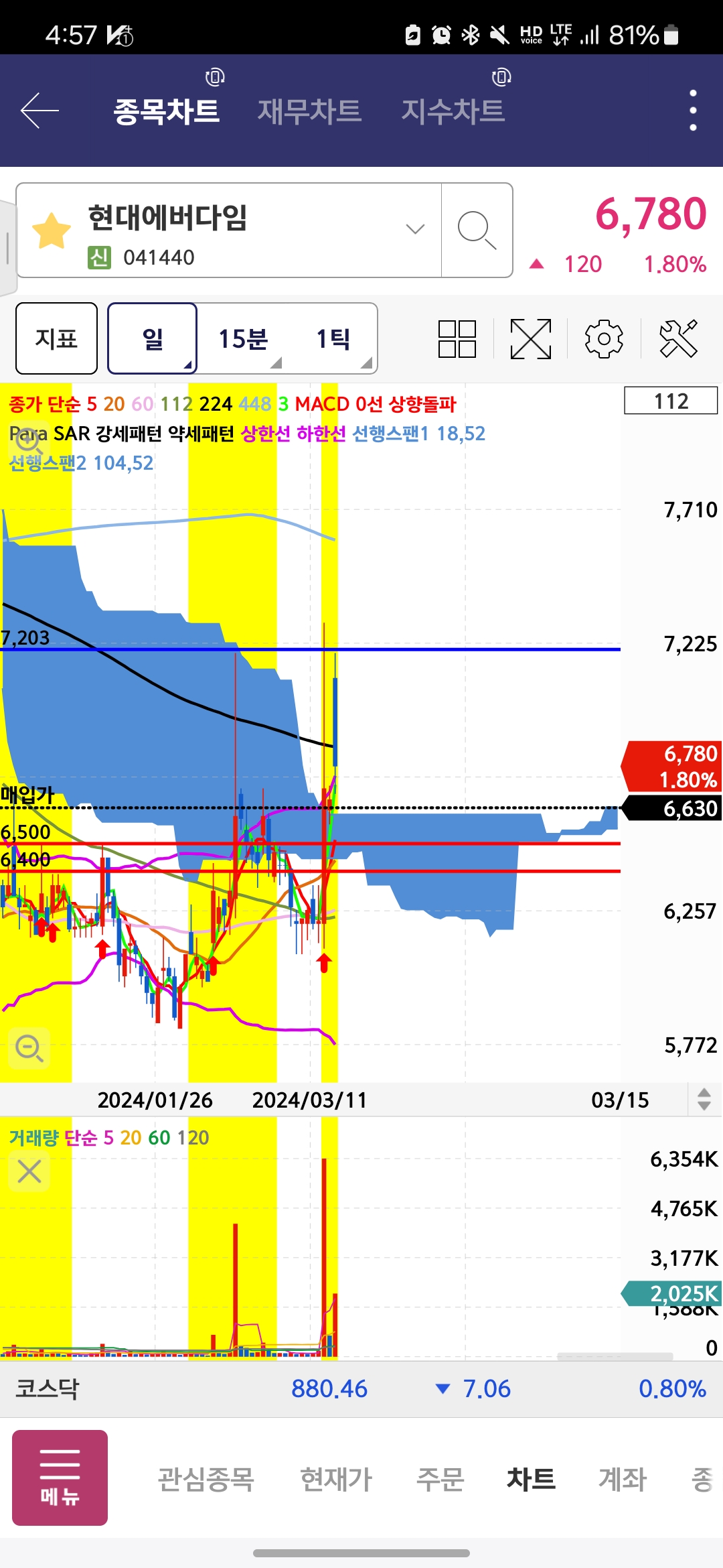 - 현대에버다임 > 양음양 패턴 / 장대양봉 다음날 거래량 줄면서 특정 가격대 지지해줌 / 우크라이나 재건, 건설 / 10%
