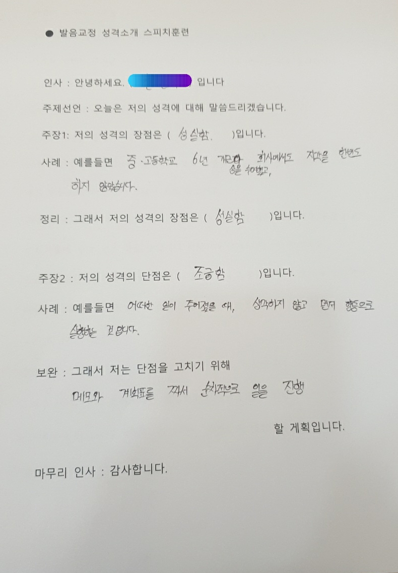 ㅅ,ㅈ,ㅊ 발음이 잘 되신다면 자기소개 문장을 작성하여 외워서 한번 읽어보세요! 자기소개는 회사면접때도 필요한 것이니 잘 작성해서 준비하시면 더욱 좋겠죠?