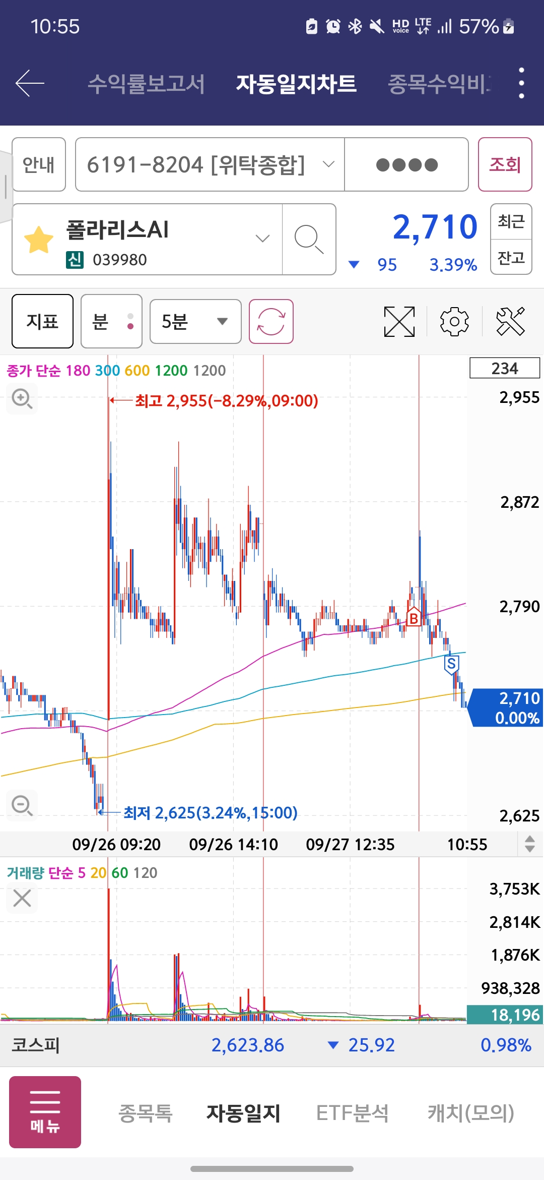 AI관련 테마로 3,5일선 타고 강하게 상승나와줄 것을 기대하였으나, 약간의 수익만 주고 바로 빠져버려서 대응하지 못했다. 오전에 병원간다고 신경도 못쓰고 안타까운 매매였다.