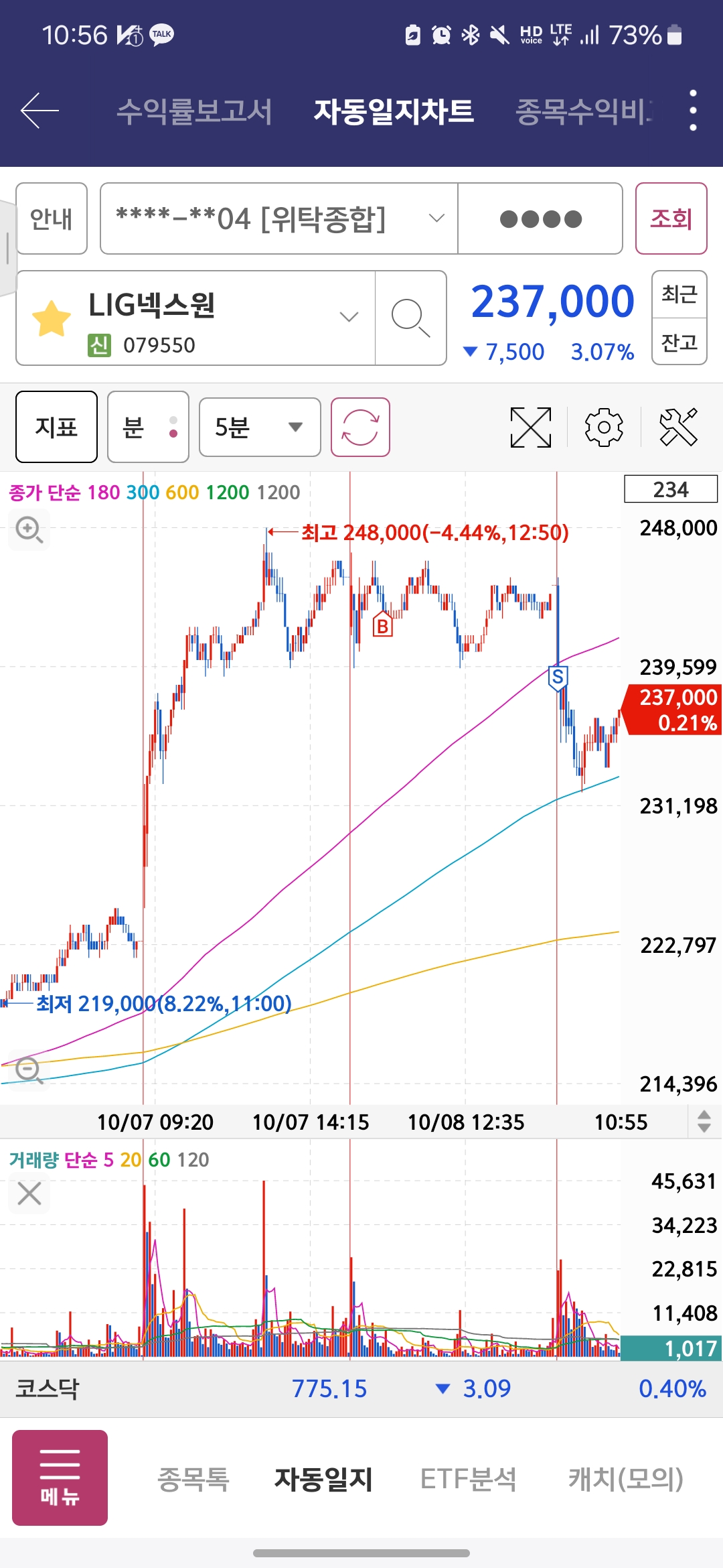 1. 방산테마 + 3일선 눌림 + 전쟁이슈 + 전고점 돌파 + 외인 기관 수급 연속성으로 시원하게 전고돌파 할줄 알았는데 3일선 깨고 5일선에서 지지받고 있다. 한 번 뺏다가 가는건지 아님 5일선에서 잠깐 반등하고 빠질지는 모르겠지만, 아쉽게 손절했다.