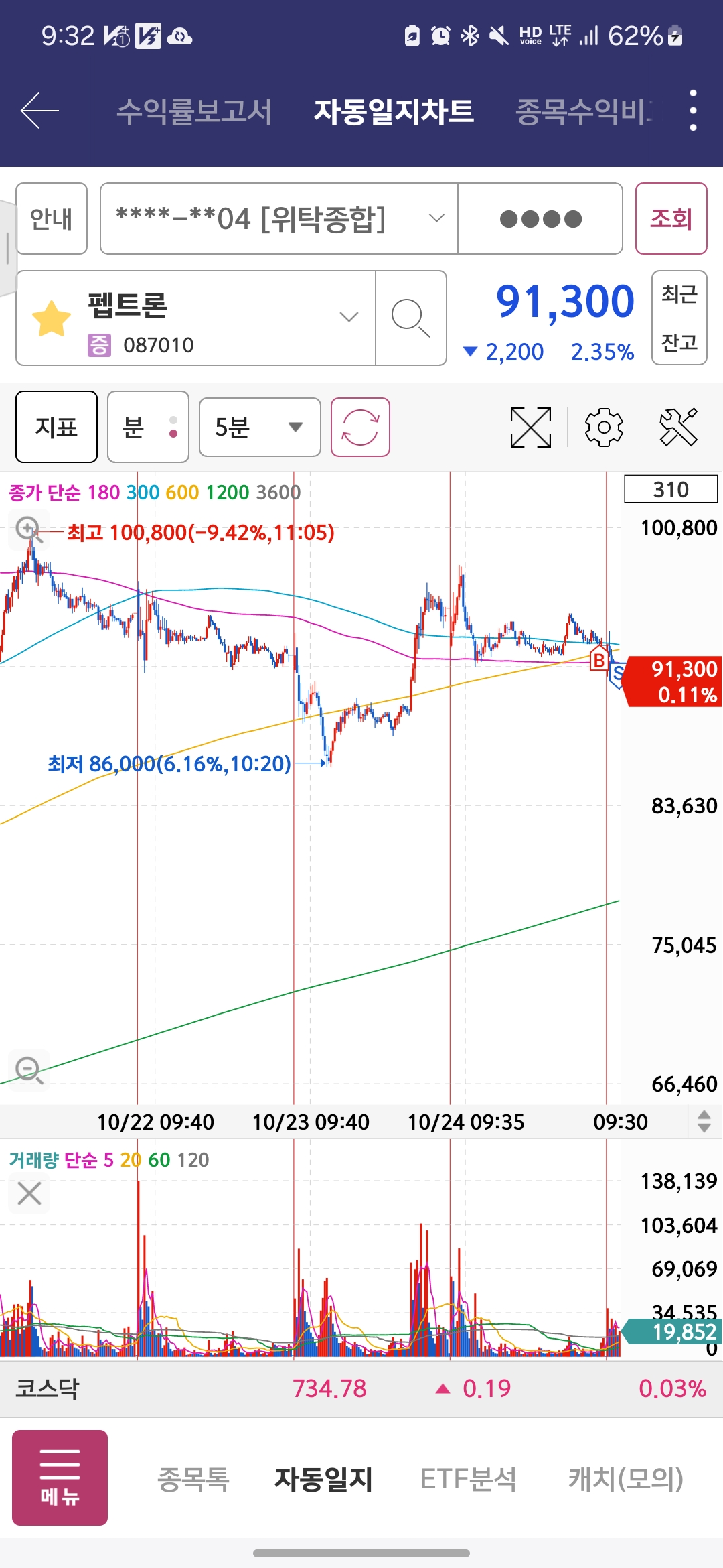 비만치료제 대장주 + 3,5일선 눌림 + 일정하진 않지만 길게 두고 봤을 때 기관 외인의 수급 흔적 + 바이오 하락, 방산 하락하면서 그동안 관심 떨어져있던 비만치료제 다시 한 번 시세 줄거라고 생각했는데 약손절로 마무리 함.
