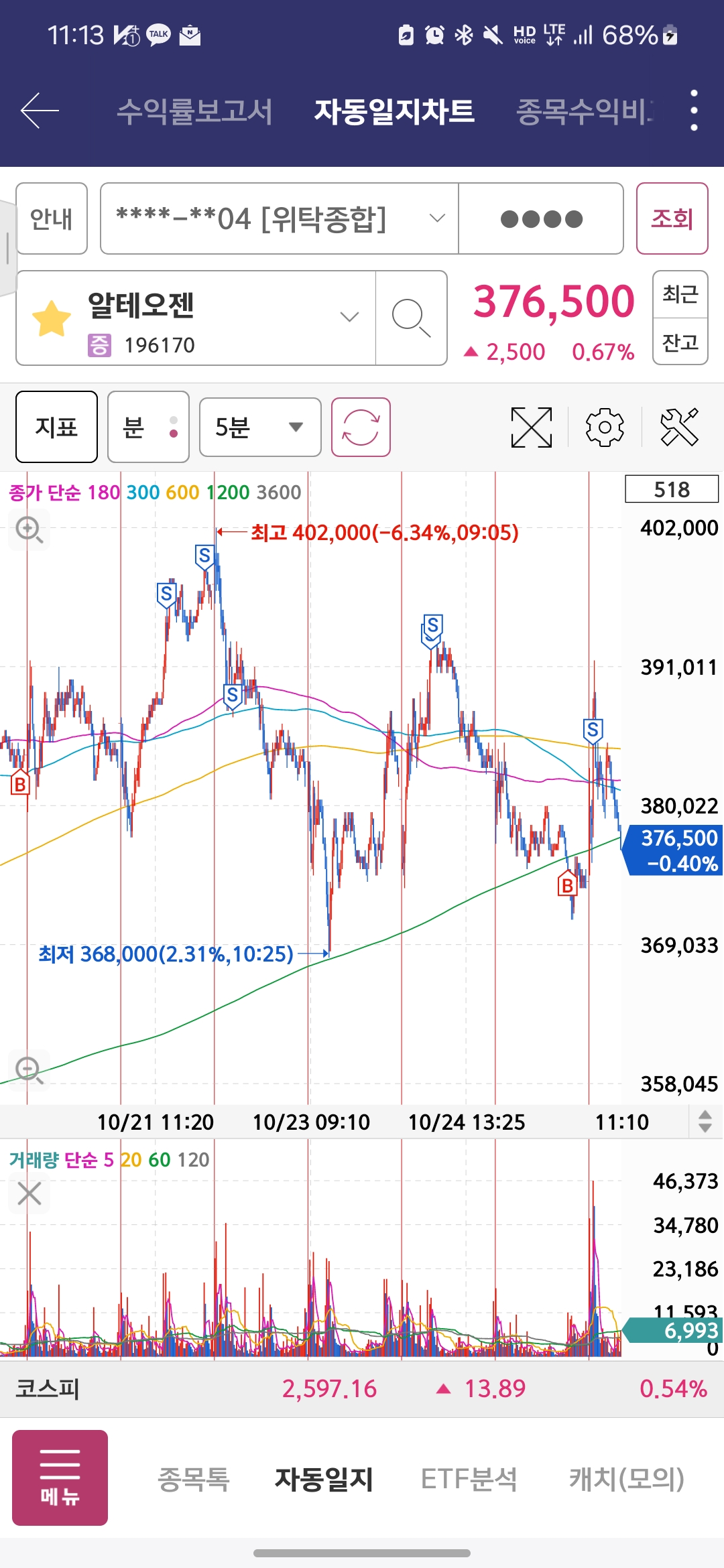 바이오 대장 테마 + 20일선 눌림 + 수급 확인 + 바이오 테마가 쉽게 죽지 않아서 다른 바이오 종목들이 오를때 미리 종가에 사놓고 다시 알테오젠 수급 들어오면 시가에 잔량 매도하였음.