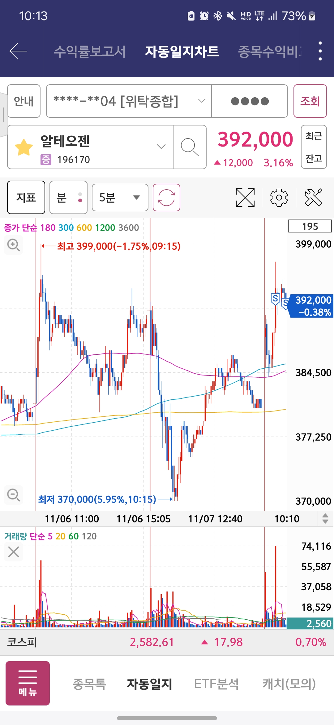 바이오 대장주 + 금리인하 기대감 + 10일선 눌림 + 악재없이 주가가 빠졌다가 눌림 + 미국장 상승 흐름 + 위아래 변동폭 3%왔다갔다 박스권 형태로 타이밍 잘 잡으면 계속 발라먹을 수 있을거란 기대감