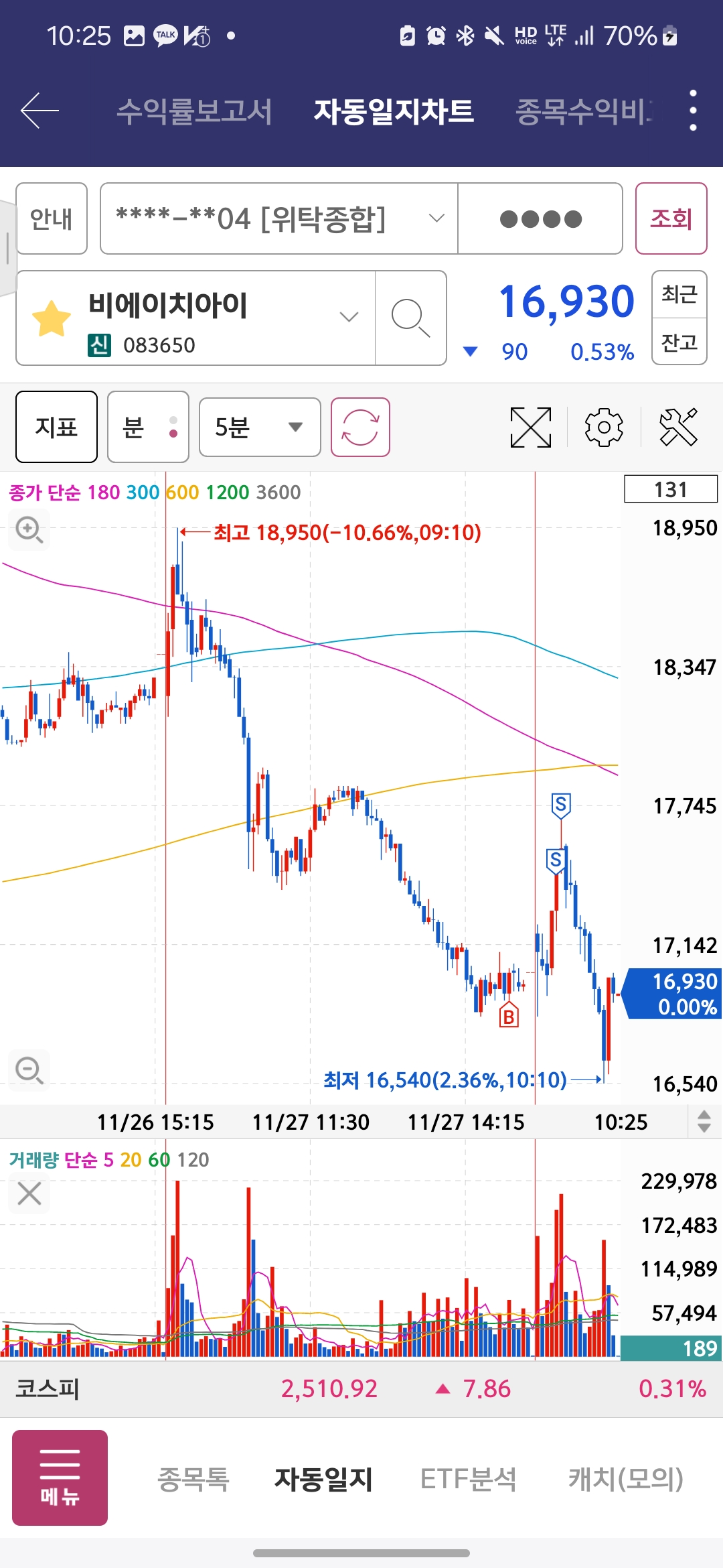 이틀전에 샀는데, 금방 시세를 주지않고 위아래로 살짝씩 흔들어서 5일선 자리에 스탑로스 걸려서 팔렸다. 수급 나쁘지않고 전고돌파 자리여서 좀 먹을 수 있겠다 싶어서 비중좀 태웠는데 실패 ㅠ 다른것들로 어느정도 커버하긴해서 다행이지만, 아쉬운 선택이었다.
