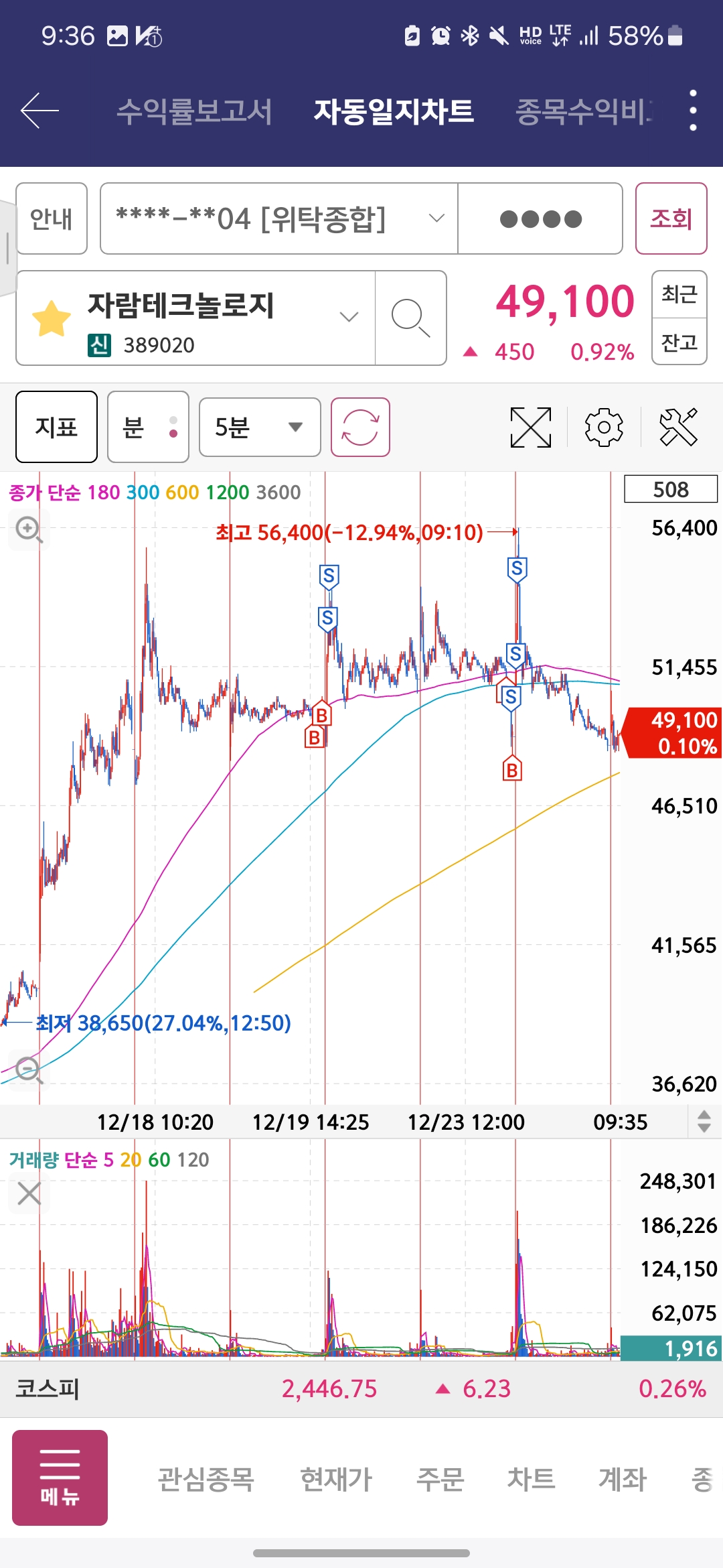 이것도 12월 23일 매매일지에 있지만, 절반 익절하고 남은 잔량 들고있다가 시초가에 정리한 모습이다. 시가에 시세 반짝주고 빠져서 전부 익절했는데 오휴장에 다시 반등을 줬다. 오전에 빠지고 안올라오는 종목이 태반인데 이런 케이스는 예외라 아쉬움은 없다.