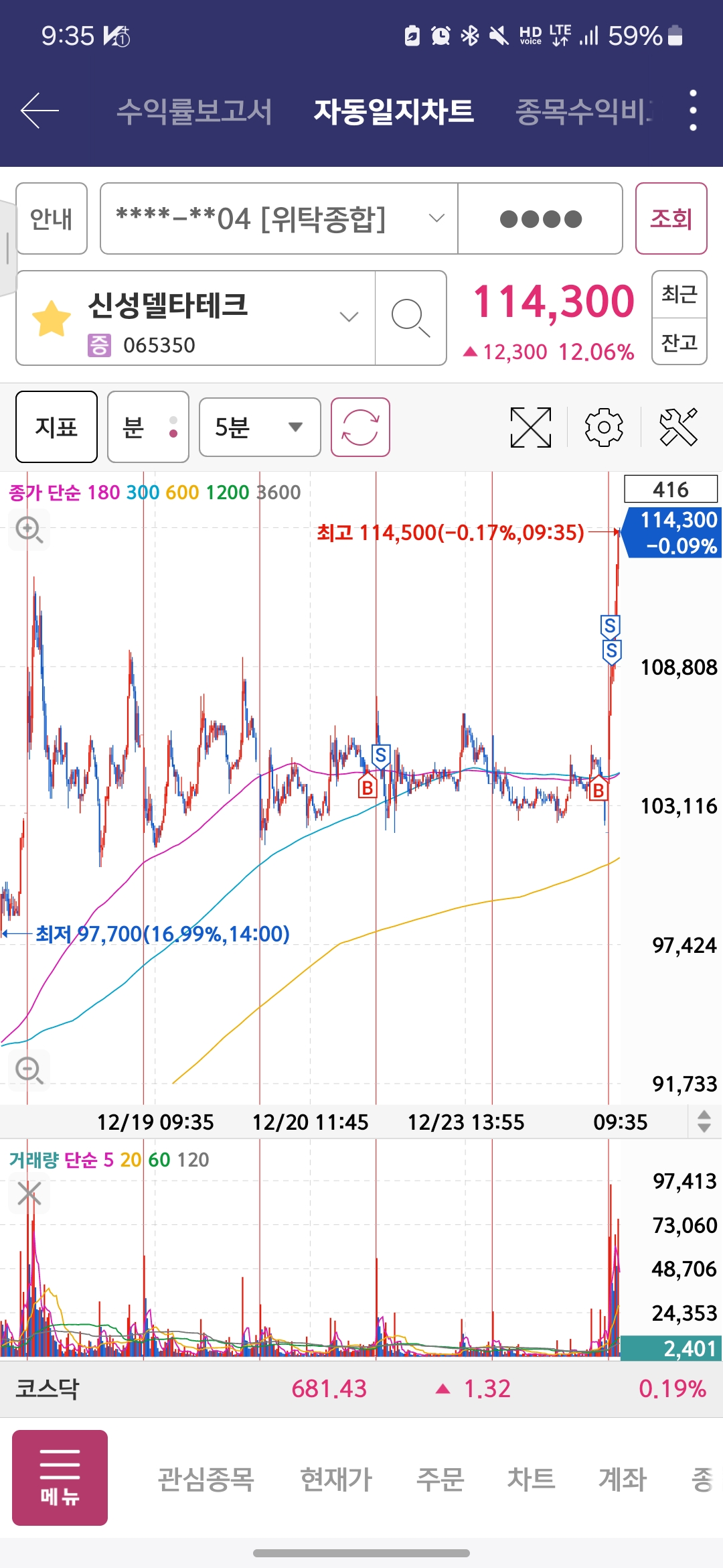 초전도체 테마로 유명하지만, 지금은 양자쪽 테마로 엮여있어서 다른 양자 종목들이 움직일 때 이 종목은 기관 수급 꾸준히 들어오면서 3, 5일선 주위로 맴돌고 있었다. 이 종목도 12월 24일 종가베팅했는데 장 끝나기 5분전부터 또 투매가 나오더니 손절되기 일보 직전에 장마감되었다. 저번 자람테크놀로지랑 비슷한 경우인데 일부러 개미털기위한 프로그램이 작동하는 것인지 뭔가 이상하다. 그래도 금일 시가에 적당히 수익 냈고, 아쉬운건 5분봉 5선 이탈 안했는데 너무 빨리 팔아서 큰 수익을 못보았다. 매도는 진짜 예술의 영역인듯하다..