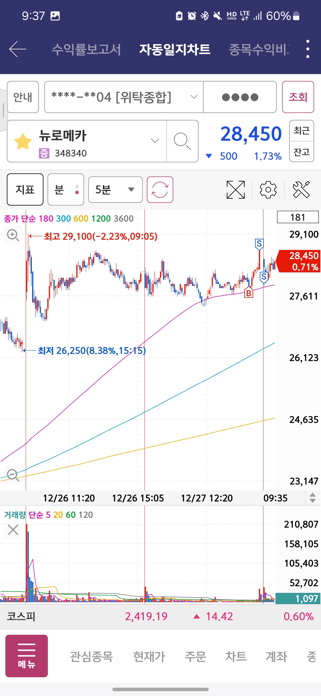 뉴모로픽 반도체 테마로 수급 나쁘지 않았고 10일선 위로 다시 올라와주는걸 보니 반등 한 번 나오려나 보다? 싶었는데 오전장에 털리고 다시 본전으로 회복해주었다. 제주항공 영향으로 오전에 투심이 별로 안좋았는데 그 때 손절이 나갔다.