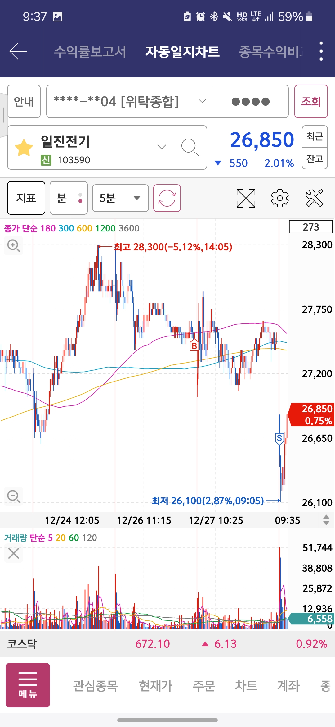 외인 기관 수급이 좋았는데, 이것도 제주항공의 영향인지 오전에 갭하락이 나왔고, 손절가를 바로 이탈해버려서 시장가에 던질 수 밖에 없었다. 던지고 나서 오전에 투심이 회복되면서 일진전기 주가도 다시 본래자리로 돌아와 주긴 했는데, 산일전기 빼고는 전력설비쪽 투심은 그닥 좋지 않았다.