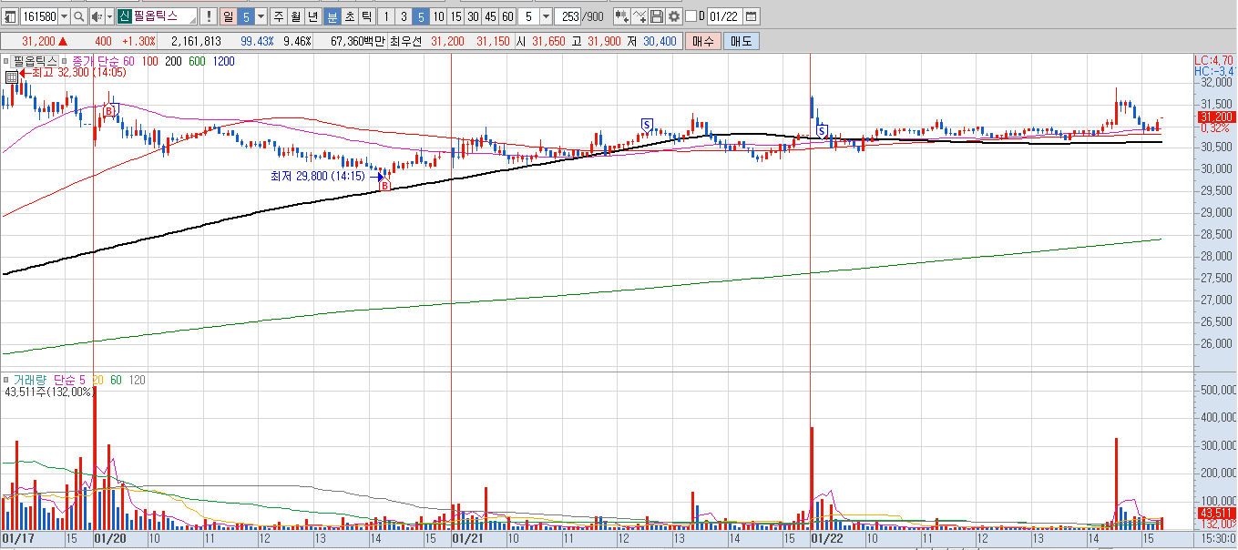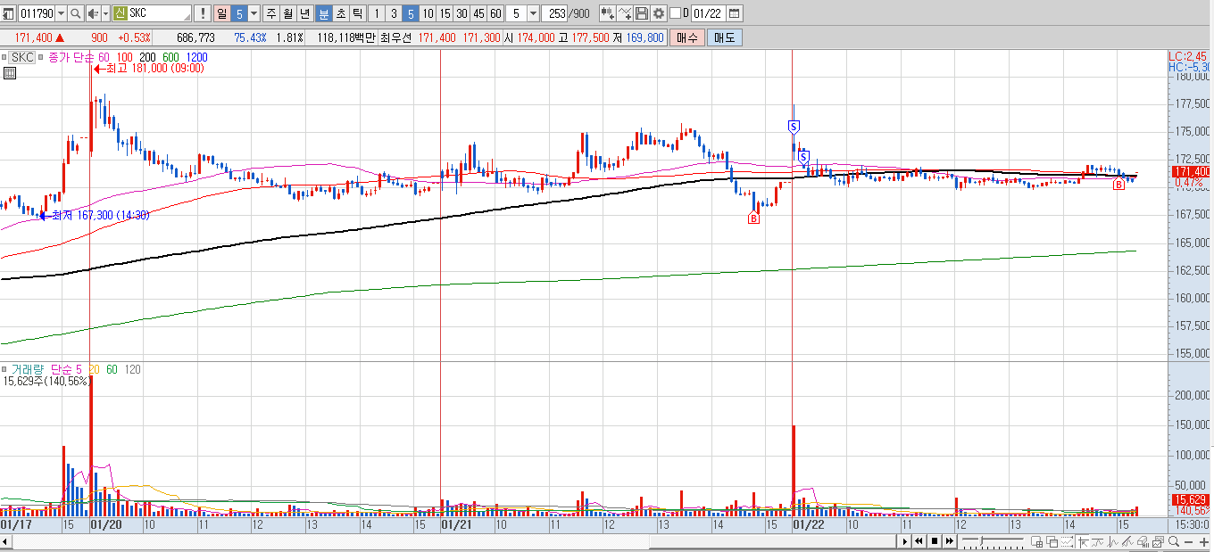 이건 이틀 전에 샀던거 오늘 마저 익절한 케이스. 크게 상승은 안나와주어서 그냥 마무리했고 종가에 원래 필옵틱스 사려고 했는데 거래량 지표보면 막판 2시40~50분 부터 장초반 상승과 비슷한 거래량이 터지면서 내꺼 사지기 전에 먼저 올라가버려서 SKC를 산 경우이다. 보통 장 막판에 저렇게 올라버리면 다음날 갭하락 하던데 어떨지 궁금하긴하네.. 차라리 SKC가 올랐으면 좋겠다 하는 마음~