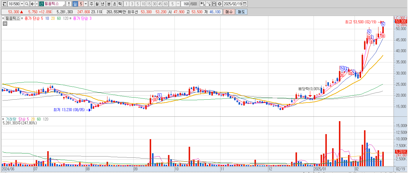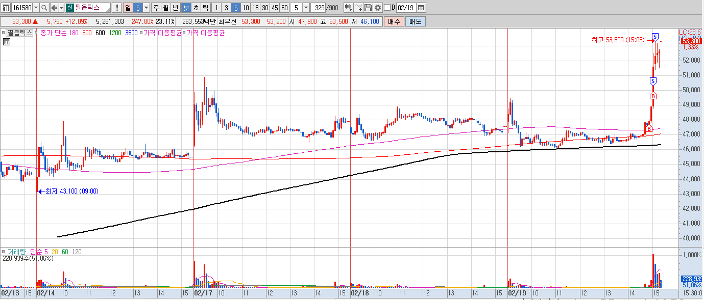 제이앤티씨 손절하고 종가즈음 필옵틱스 차트를 봤는데 기간조정이 생각보다 잘 나와주었고, 전에 쌓여있던 매물대도 없고 현재 강력한 테마도 없다보니 내일은 유리기판쪽으로 수급이 들어오지 않을까 판단하에 일찍 매수에 참여하였다.