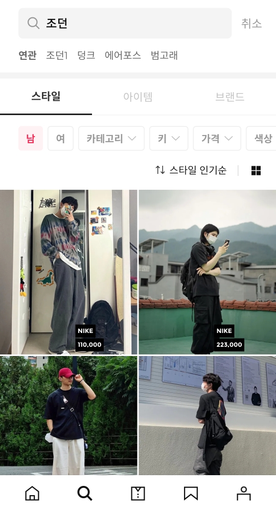 검색창에 조던이라고 검색하면 다양한 룩들을 즉시 확인이 가능하고 필터적용으로 원하는 룩을 골라낼 수 있습니다!