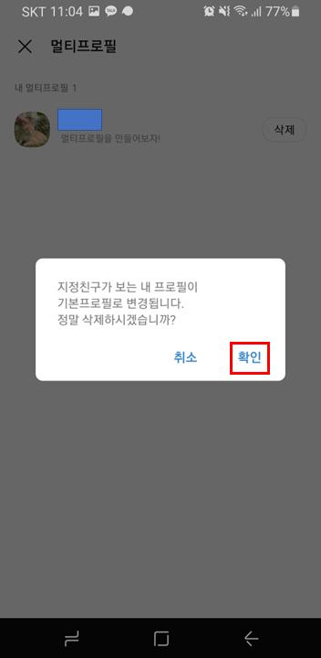 그러면 멀티 프로필을 삭제할 것인지 묻는 안내문구가 나타나며, 멀티프로필 삭제 시 지정돼있던 친구는 본인의 기본 프로필을 볼 수 있다는 설명까지 나옵니다! 여기서 확인을 눌러주세요~