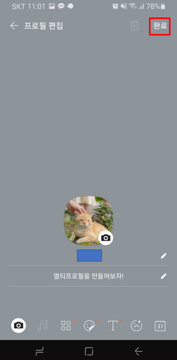 여기서 평소 프로필 설정할때와 똑같이 프로필 사진, 상태 메시지 등등 설정해서 우측 상단에 완료 버튼을 눌러주세요!
