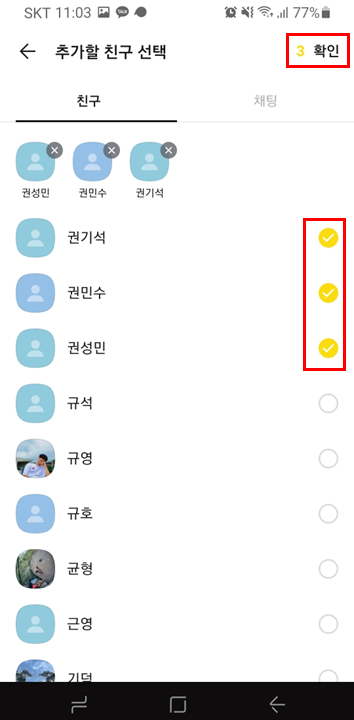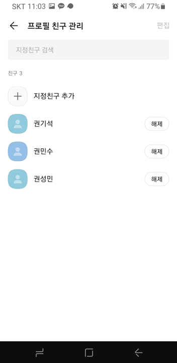 우측 상단 확인버튼을 눌러서 하단에 권기석, 권민수, 권성민이라는 세 분은 제가 만든 멀티 프로필을 바라보게 되는 대상이 되었습니다!