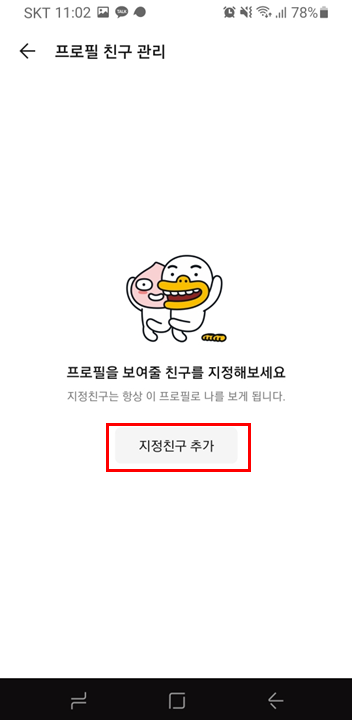 프로필 친구 관리에 들어오면 카카오 이모티콘 하단에 지정 친구 추가라는 버튼이 있습니다.