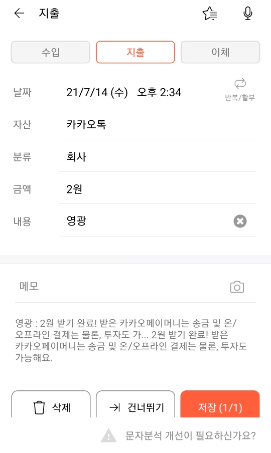 (제가 영광이라는 친구에게 2원을 송금했을때 편한가계부에서 인식하고 알람이 나타난 모습입니다!)