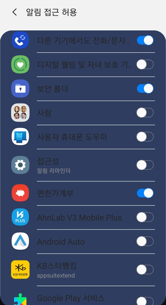 문자함에 들어오셨다면 금융 어플 알림 설정 OFF를 ON으로 바꿔주셔야 해요! 그러기 위해선 휴대폰 알림 접근 허용에서 편한가계부를 허용 시켜주셔야 하구요!