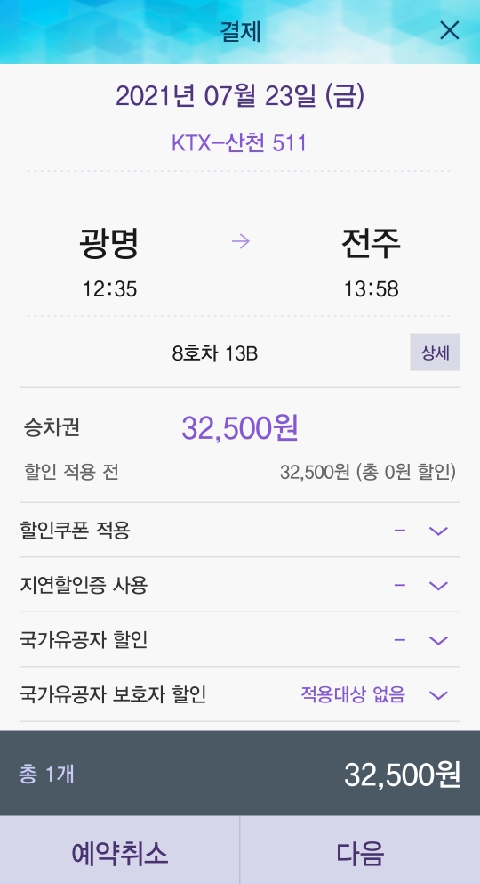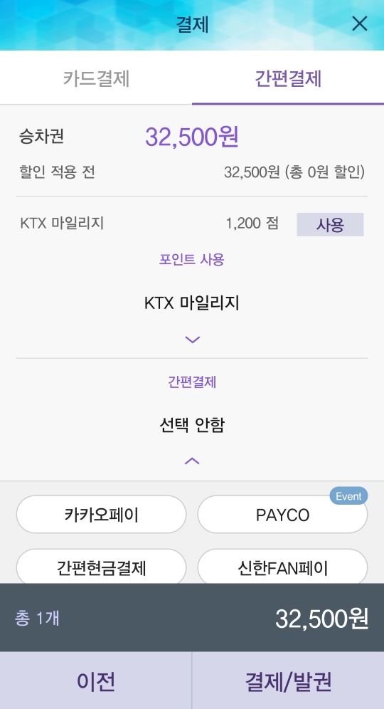 다음을 누르면 결제창이 나타나고 상단 카드결제, 간편결제 선택에서 본인이 편하신걸로 결제해 주시면 승차권 예매가 끝이납니다!