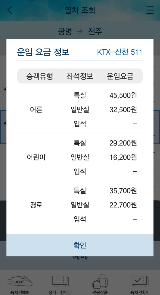 열차의 일반실과 특실을 선택하면 열차시각, 운임요금, 좌석선택이 가능합니다!