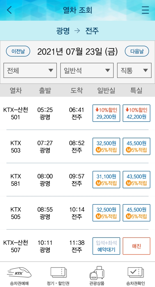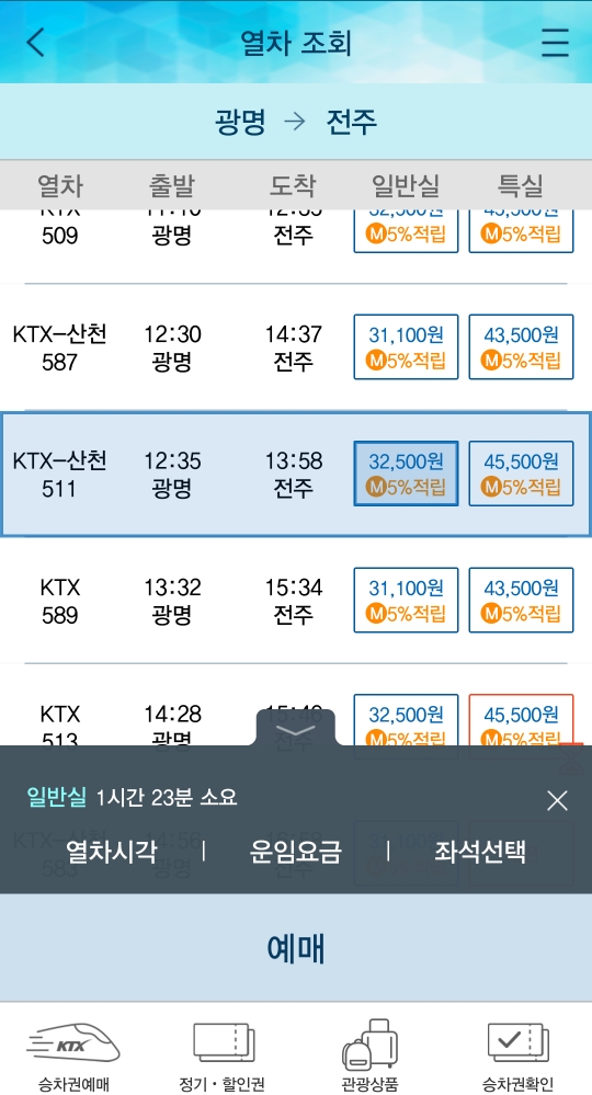 열차 조회하기를 누르면 선택하신 지역으로 이동하는 열차의 시간과 정보, 일반실과 특실 선택이 가능합니다. (열차마다 중간에 가는곳도 다르고 이동시간이 상이하니 시간에 민감하신분들은 꼼꼼히 체크해주세요!)